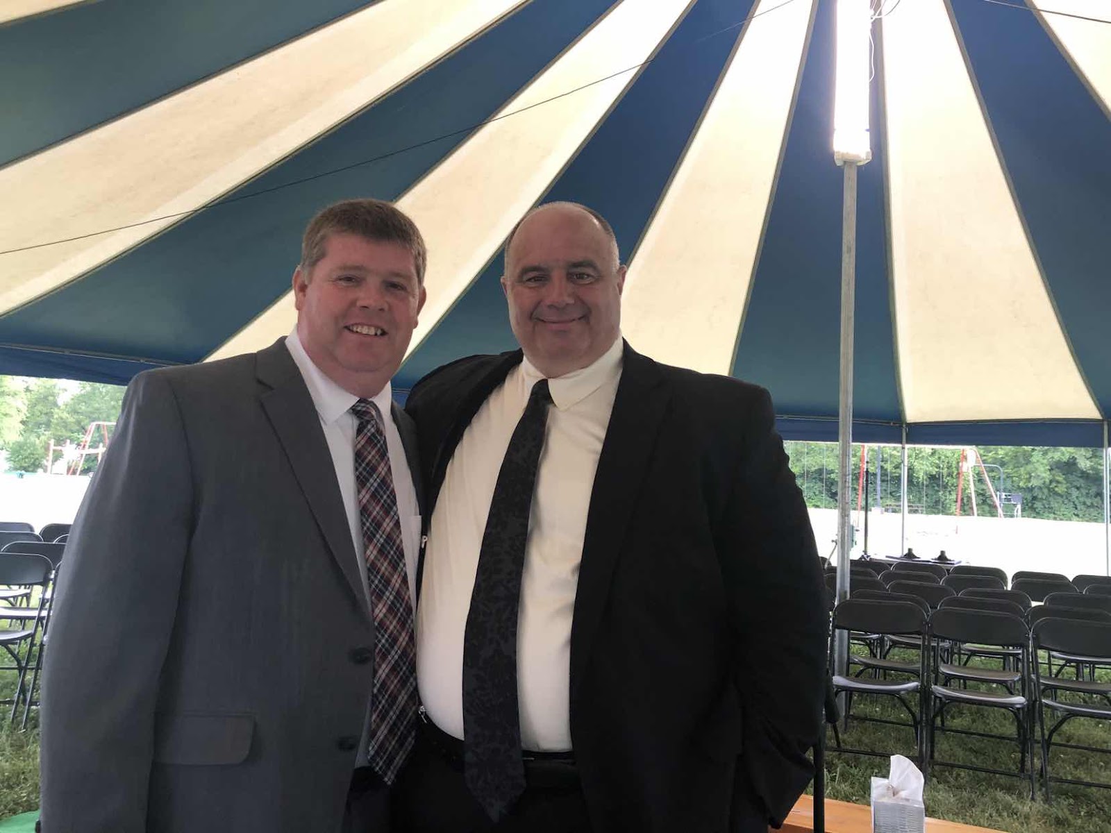 You will see that we had to have the back wall put up a night or two, but we have been spared rain during the services for the most part. None of the other walls had to go up. When it is raining or threatening rain, we need the back wall up in order to protect all of the sound equipment and instruments.
